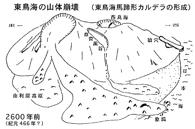 カルデラの形成・象潟岩屑なだれ(ステージIIIa/IIIb):約2600年前に,東鳥海の山頂付近で大規模な山体崩壊が起こり,北に開いた馬蹄形カルデラが形成された.これを東鳥海馬蹄形カルデラといい,七高山-行者岳-伏拝岳-文珠岳-蟻_ナ戸渡-稲倉岳に囲まれる凹地形である.この時の崩壊堆積物(象潟岩屑なだれもしくは象潟岩屑流と呼ばれている.かつては象潟泥流と呼ばれていた)には木片(埋もれ木)が含まれている.それらから得られた放射性炭素を用いた同位体年代値が数多く報告されており,2600年前とも3000年前ともされているが,ここでは2600年前としておく(その後,埋もれ木の年輪を調べることにより,紀元前466年であることがわかった).山体の崩壊量は3.5立方km(これは,1888年の磐梯山や1980年のセントヘレンズの崩壊量よりも大きい),岩屑なだれの流走距離は最大25kmに達した.セントヘレンズなどでは,新たなマグマの上昇が山体崩壊の原因であったが,この岩屑なだれでは新しいマグマが崩壊に関与していた証拠は見つかっておらず,崩壊の原因が噴火であるのか地震が引金となったのかはわからない.崩壊物の主体は北へ崩れ落ちた後,白雪川に沿って北西へ向きを変えて象潟平野へ広がり,先端は日本海に突入したが,一部は比高100mの谷壁を乗り越えて直進して由利原高原に堆積した(写真4).比高5-45m,長径10-400mの流れ山が300個以上認められる.流れ山の内部は,溶岩岩塊が細かく破砕されてはいるが,もともとは1つの巨大な岩塊であることも多い(写真5).この岩屑なだれの堆積によって,象潟平野では内陸にせき止め湖(象潟町本郷付近)が,海岸には潟湖(古象潟湖と呼ばれる)が形成された.1689年に象潟を訪れた芭蕉は,この風景を見て,“江の縦横一里ばかり,おもかげ松島に通ひてまた異なり.松島は笑ふが如く象潟はうらむが如し.寂しさに悲しみを加へて,地勢魂をなやますに似たり 象潟や雨に西施がねぶの花”,と奥の細道に残している.この潟湖は1804年の象潟地震による地盤隆起で干上がってしまった.現在では国の天然記念物に指定されている.なお,内陸に形成されたせき止め湖は,奈曽川から排水されて現在では消滅している.