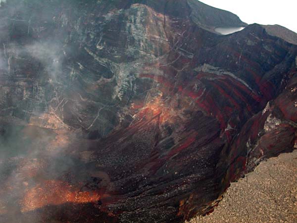 カルデラ内の様子 北西側にあったマウンド(高くなった?、ような気がする)の 南側に真っ黒い物体が広がる(写真4)。その正体はヘリ観察時にも判断できず、さらに気象庁でビデオを見直してもなんであるのか決定的な証拠がなかった。固結したアア溶岩?、まさか、とも思ったりもした。しかし、島状に孤立した黒い箇所もあるので、ほんものの溶岩とは考えにくかった。その後、 気象庁から、1月10日の 映像に映っていた水たまりと形状が似ていることが判明した(このときの水溜まりの色は茶色)、と連絡があった。翌日(23日)、やや面積が狭いものの同様の黒色の水たまりが12月29日撮影の川辺氏撮影画像にもあった。その写真では見えないが、1月22日の写真では“水たまり”の南側には東西に連続した断差ができているらしい(写真5)。断層崖か? 。カルデラ壁には溶岩の成層構造と縦にのびる岩脈、貫入岩体が顕著に見えた(写真6)。