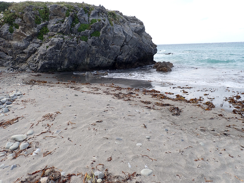 (北緯:41.424805、東経:141.456324)下北半島北東端の尻屋崎。ここには寒立馬(かんだちめ)を見に来た。外来種と交配しているので在来馬とはいえない。「12世紀から馬を生産、15世紀にはロシア、韃靼、モンゴルから馬を輸入、また、明治政府が外来種との交配で馬産振興を図った」などと書かれた古い看板があったが、真偽の程は明らかではない。この時期、寒立馬は灯台の付近にはいなかったが、地元の方にどこで見られるのかを教えてもらった。尻屋崎灯台のすぐに近くに小さな砂浜を見つけた。