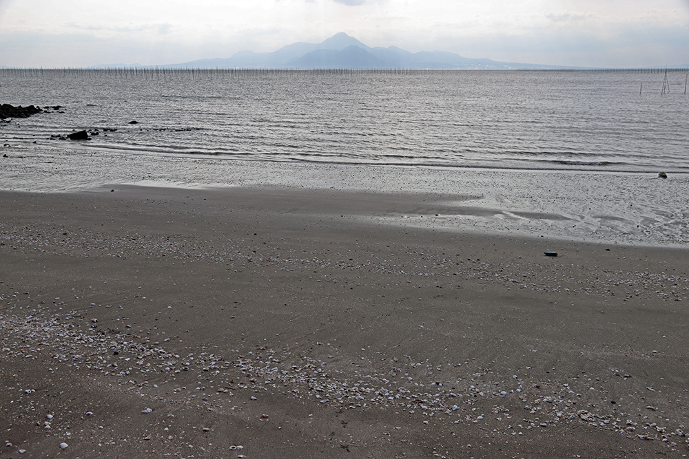 (北緯:32.814600、東経:130.592562)有明海に面して「射崎の海食」がGoogleMapに載っている。塩屋の漁港のすぐ脇だ。ネットで情報を探しても詳しいことはわからなかったが、夕陽が美しいスポットらしい。ここの砂浜に面する“海食崖”の地層は金峰山の古期山体(140〜110万年前に形成)の火砕物。有明海の向かいには雲仙岳、海上には海苔の養殖。この付近は段々畑が多く、河内ミカンの産地だ。段々畑を見ながら少し山の中に入ると宮本武蔵が籠もって兵法書「五輪書」を仕上げたとされる霊巌洞がある。