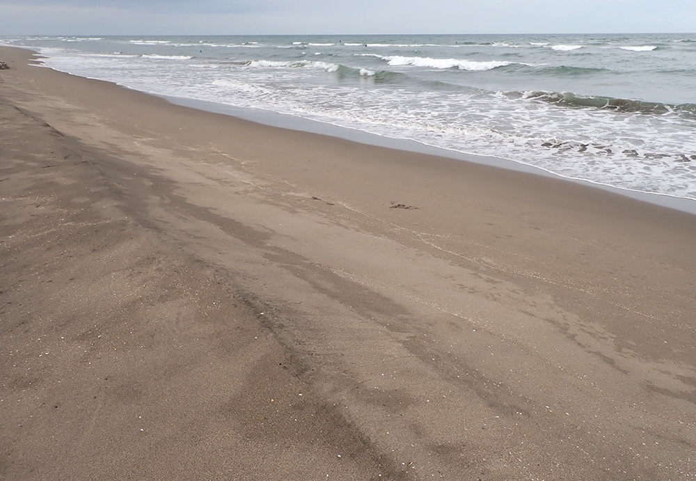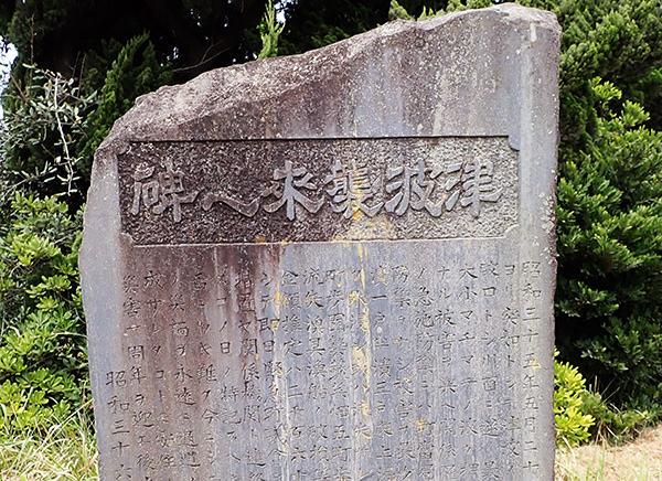 (北緯:35.450969、東経:140.406647)九十九里浜に注ぐ南白亀川の河口付近の砂浜。ここは人気がない。浜の駐車場入り口に津波襲来の碑がある。1960年に地球の裏側で起こったチリ地震の津波だ。地震発生から津波襲来まで約22時間。M9.5を記録した観測史上世界最大級の地震で、日本の太平洋沿岸各地でも被害が出た。ここに建てられた碑は小さいものだが、房総半島の太平洋側には津波襲来を刻んだ碑が10ヶ所以上も建てられているという。