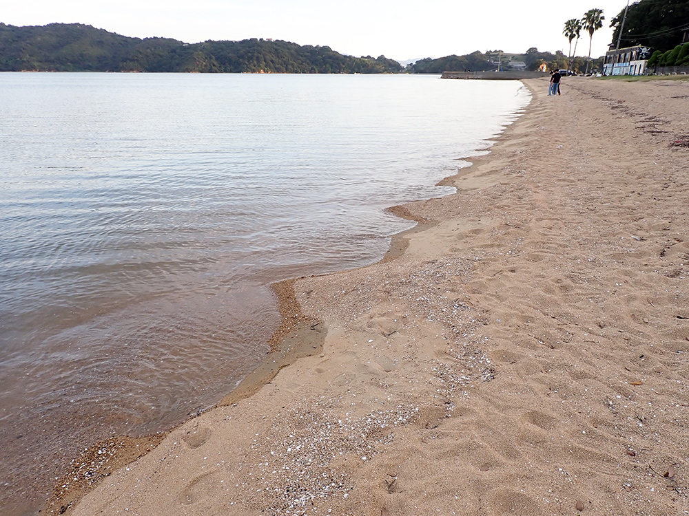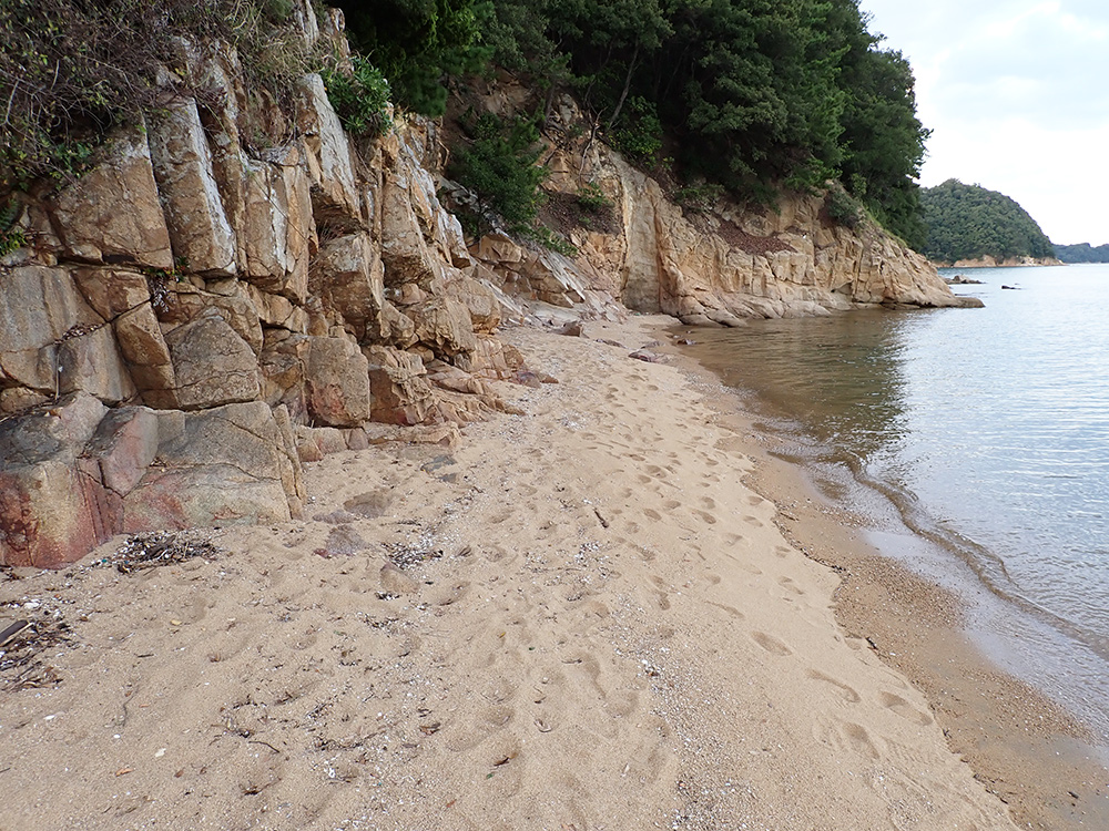 夏は海水浴客で賑わう牛窓の海水浴場。砂浜の北には後期白亜紀の粗粒な黒雲母花崗岩の露頭が続き、極粗粒から細粒砂の砂浜だ。牛窓は江戸時代、参勤交代や朝鮮通信史の停泊地あるいは宿泊地として栄えた港町だそうで、今でもリゾート地。「日本のエーゲ海」とも言われているそうだ。かつての古い町並みも残っている。