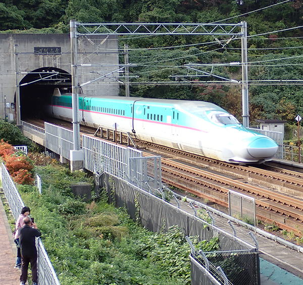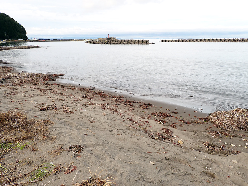 (北緯:41.182701、東経:140.462536)今別浜名漁港西側の小さな浜。この浜のすぐ近くにJR津軽線という鉄道があり、1.5 kmほど西が終点の三厩(みんまや)駅だ。ただし、2019年から無人駅、2022年の大雨災害以降、陸奥湾に面した蟹田駅から三厩駅まで運休となっており、三厩駅は2027年に廃止されることが決まっているそうだ。現在、この浜の650 mほど南には北海道新幹線(海峡線)が走り、青函トンネルの本州側入り口がある。そこには駐車場を備えた広場があり、ここで昨日のキノコ採り仲間と一緒に上り列車「はやぶさ30号」を待ち構えた。